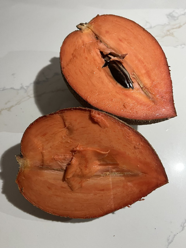 I absolutely enjoyed the flavor. This seedling is not as sweet as Key West mamey, so I could concentrate more on the unique details of its taste. My mother used to bake a carrot cake with cream cheese icing for big events and tasting this fruit my mind immediately went back to that carrot cake. I tasted a background sour note like you might enjoy in cream cheese icing or a carrot muffin baked with sour cream in the batter. Subtly sweet balanced with a hint of dairy tartness, and perfectly seasonal with Autumn here.