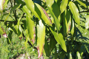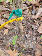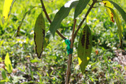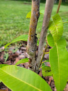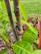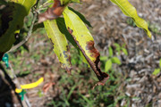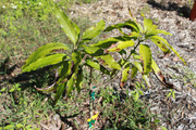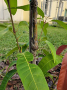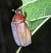 I soon discovered that a swarm of fat beetles, about 3/4" long, have been visiting every night to devour the leaves. At some point at night, they seem to fall asleep, so I am able to knock them off the leaves into a bucket of soapy water or squish them on the ground without them flying away. It is still potted, so I now move it into the garage at night.