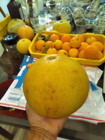 No not mine, this is a guy I met who has a Honey Pomelo tree farm, over 50 of the same trees. I went there to buy some fruits he was selling. Now he wants me to do some grafting and air layering of his tree. So, I get the fruits for free, maybe keep some air layers as well. I might just negotiate a tree for me to dig up in exchange for the air layers. These fruits are really good for a pomelo. Most white flesh pomelos that are large fruits (3-5 lbs) have no taste at all, I'm getting rid of those varieties. My Banpeiyu still hasn't produced a 10lb fruit, only 5lbs and it tastes average, nothing to brag about. I was hoping for the Halawa to fruit, but my graft died instead.