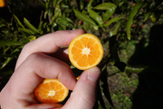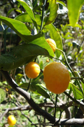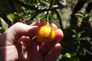 The fruit are oblate shaped, and with slight ribbing. The peel is sweet without bitterness, and the inside of the fruit is mostly sweet with some acid. At least the fruit I ate was seedless.