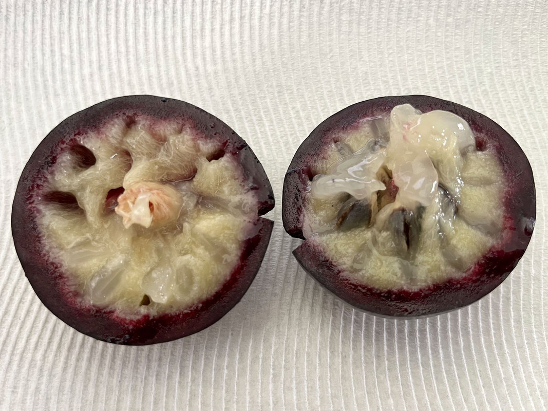 Lara Purple Caimito is a beautiful fruit slightly smaller than a baseball with dark purple skin. The colorful flesh feels like a grape in your mouth, with a juicy and squishy texture that retains a slight crispness and bite. The seed core does take up a large part of the fruit interior and I wish there was more edible flesh. Lara Purple has strong sweetness, rating about 8.5 on the sugar scale. I taste a concentrated coconut/dairy flavor that is incredibly delicious to me. The coconut sweetness reminds me of the canned Coco Lopez ingredient for Pina Colada drinks. Wow. This could get addictive!