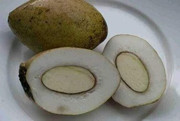 Stone fruit oval or nearly round, 7-12 × 9-16 cm, thick-skinned and glabrous, green to yellowish, dull, with brownish lenticel spots. The flesh of the fruit when ripe is pale yellow-orange to yellow, fibrous, sweet-sour in taste and contains a lot of fruit juice, pungent smell a bit like turpentine.