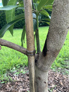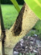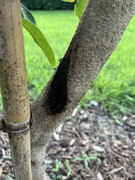 I planted this 25 gal tree about 2 months ago. I did not notice this mark when I got it, but I can't be certain. The area appears diseased, or possibly something hit it. The bamboo stake is a few inches away so I don't think it was that. Any idea what this is and how to treat it or how serious of a problem it is? Thank you