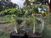 This is not the first time growing papaya for the first time ever. Check out my TR Hovey papaya trees below. They are in 27 gallon storage totes